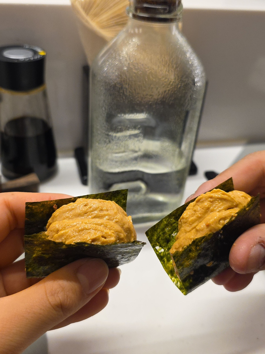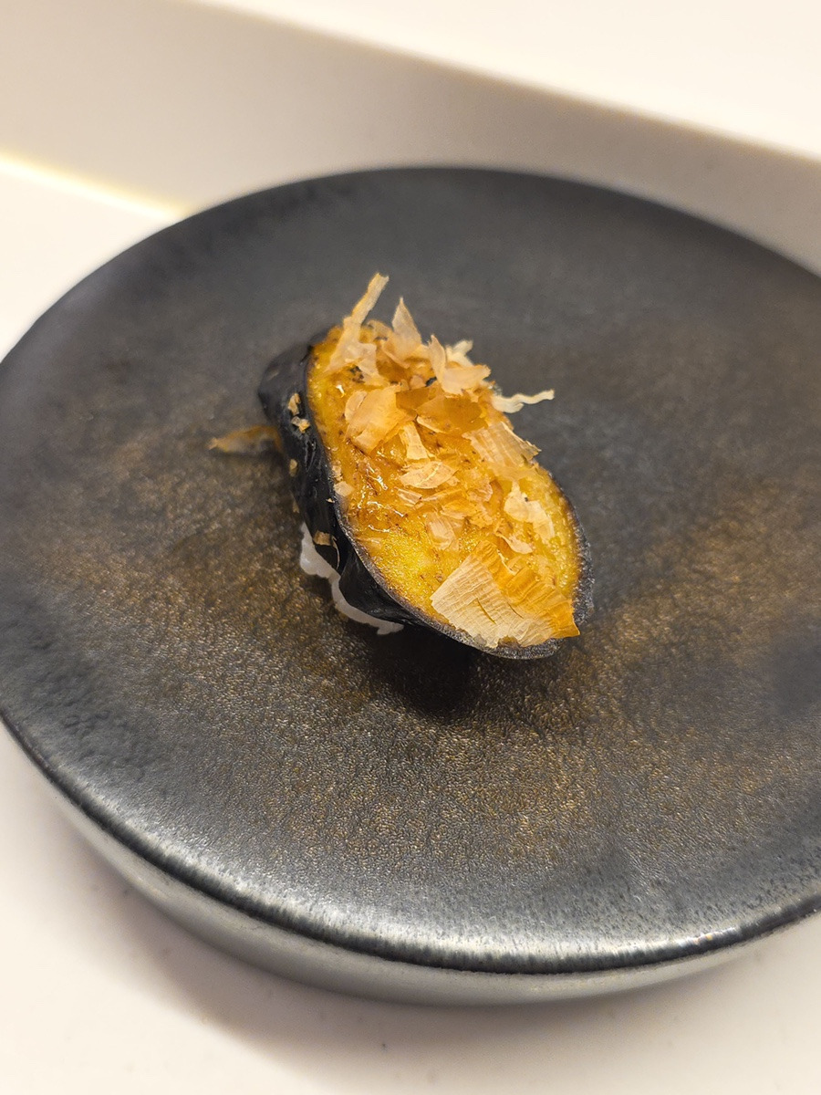 가다랭이포 가지 초밥: 보기 드문 구성으로 오마카세의 재미를 더합니다.