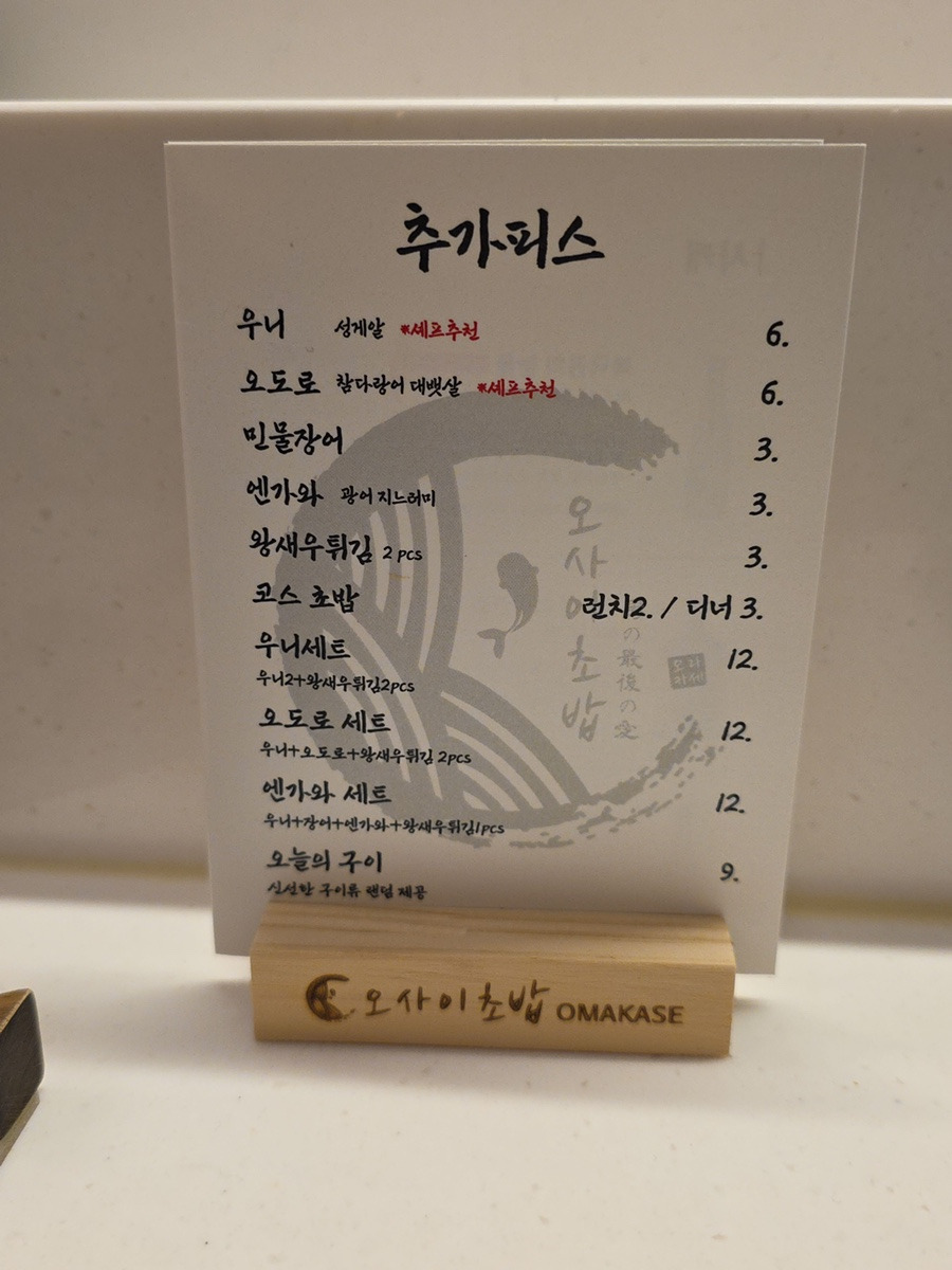 예약제로 운영되어 정시 입장이 필수입니다. 타이밍을 맞춰야 하는 점이 번거로울 수 있지만, 셰프님의 친절한 설명과 재료에 맞춘 세심한 구성 덕분에 전체 만족도가 높습니다. 가성비 오마카세 입문용으로 추천할 만합니다.