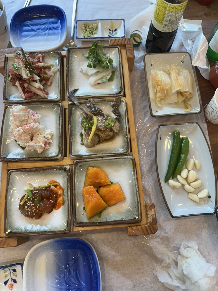 코스 메뉴의 스끼다시는 정말 푸짐해요. 해삼, 멍게, 전복, 간장게장 등 입이 즐거운 구성으로 시작부터 만족감이 높았어요.