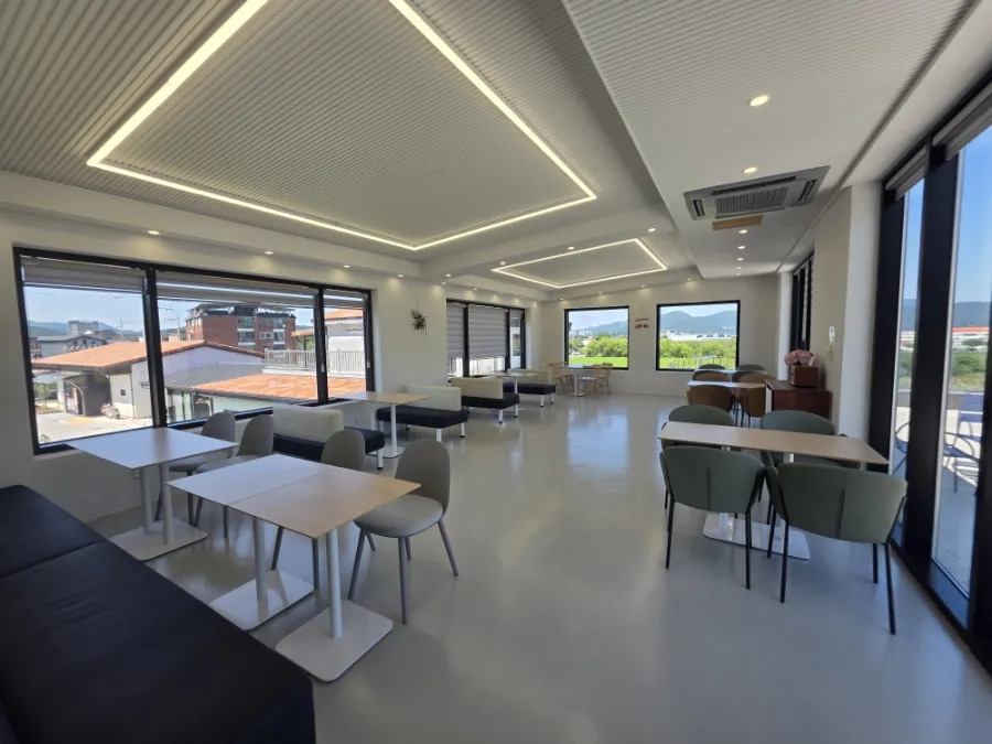 통창 너머로 산과 마을이 보이는 넓고 쾌적한 실내,