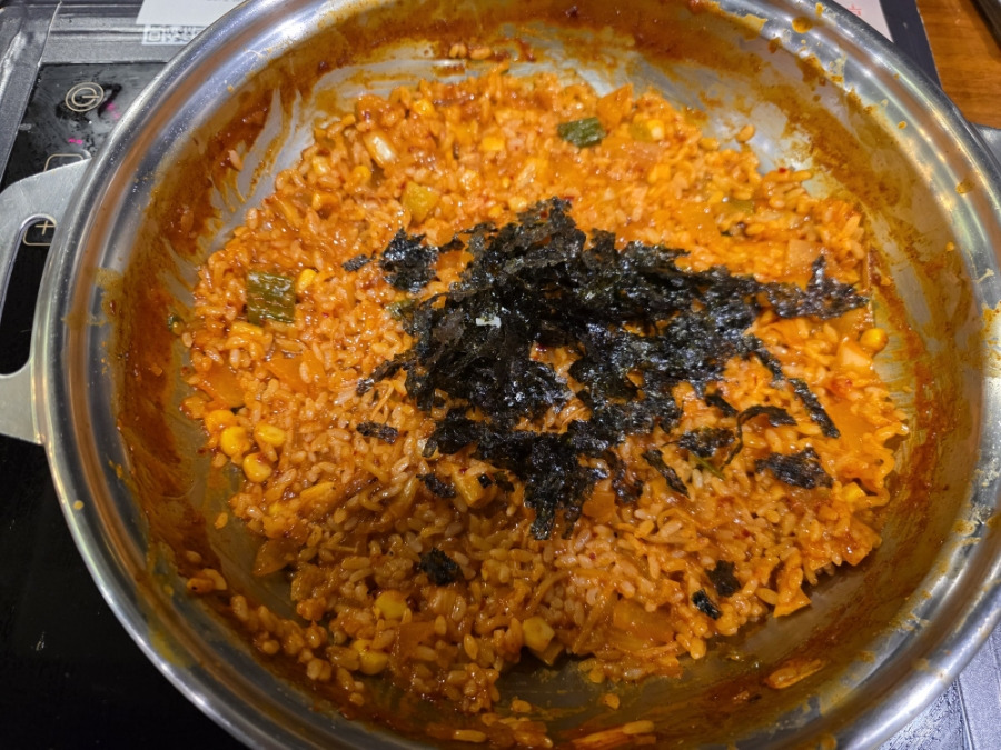 밥, 김가루 등을 넣어 직접 철판에 볶아 먹으면 정말 별미에요. 배가 불러도 꼭 해먹어야 해요.