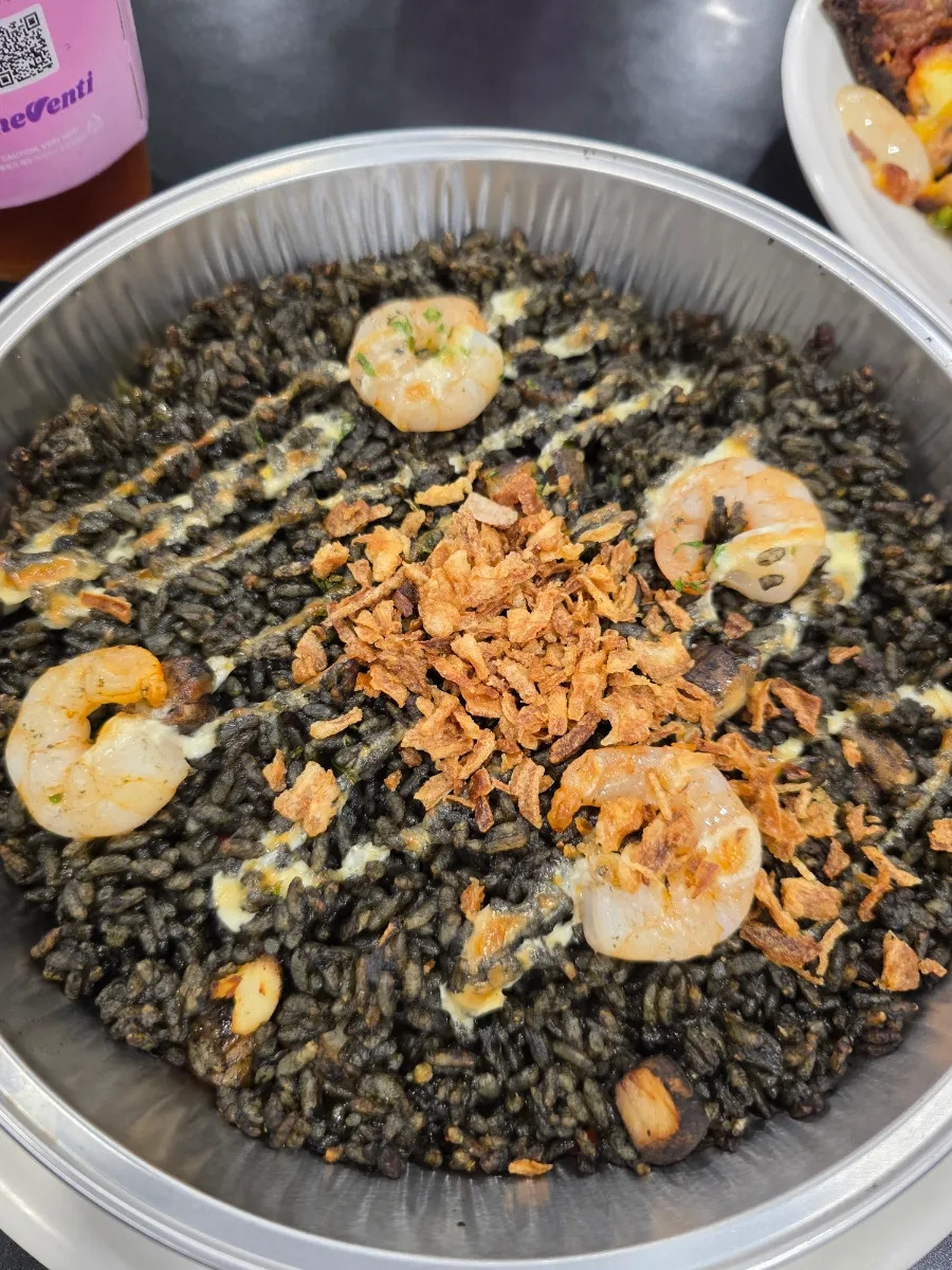 오징어 먹물로 만든 흑미 밥에 새우, 오징어살, 마늘 슬라이스가 듬뿍 들어가 있어 식감과 풍미 모두 굿!