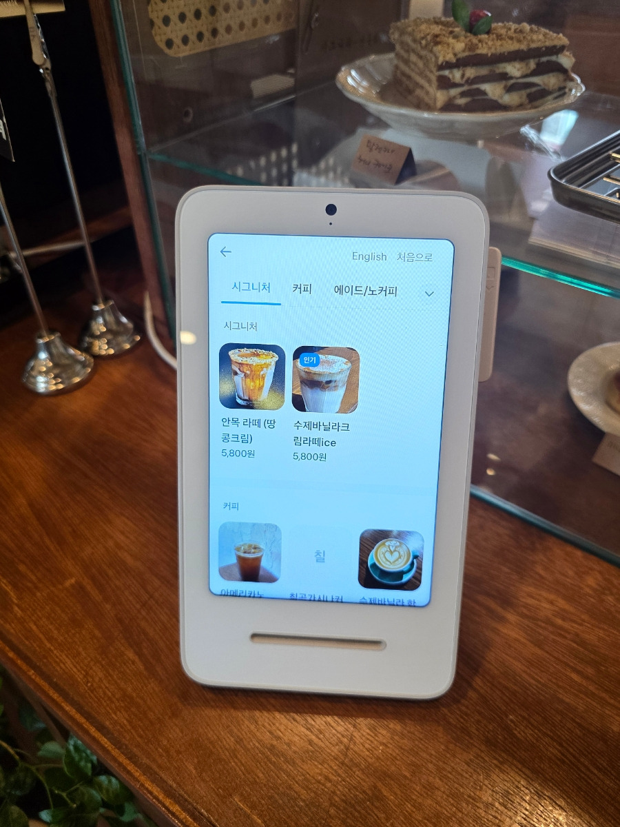 입구에 들어서면 아담한 키오스크로 주문할 수 있고, 내부는 깔끔하고 아늑하지만 좌석은 많지 않아요.