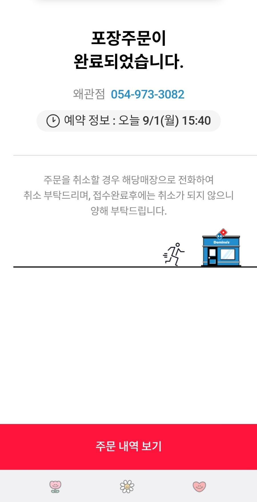 수령 시간은 오후 3시 40분으로 설정했고, 도미노피자 왜관점(☎ 054-973-3082)에서 포장했습니다.