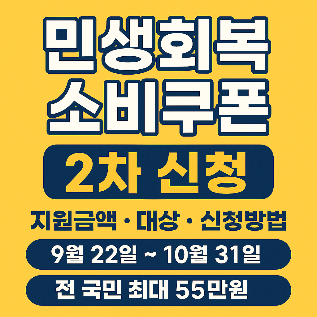 민생회복 소비쿠폰 2차 신청은 2025년 9월 22일부터 10월 31일까지 진행되며, 전 국민 90%가 1인당 10만원을 추가로 받을 수 있습니다. 지역사랑상품권과 카드 방식으로 지급되며, 2025년 11월 30일까지 사용해야 합니다.