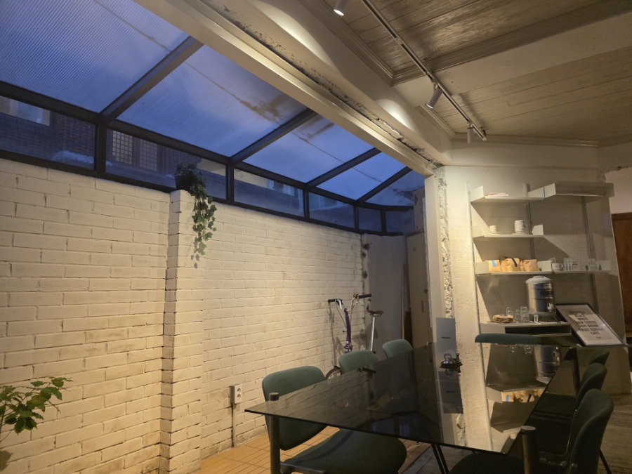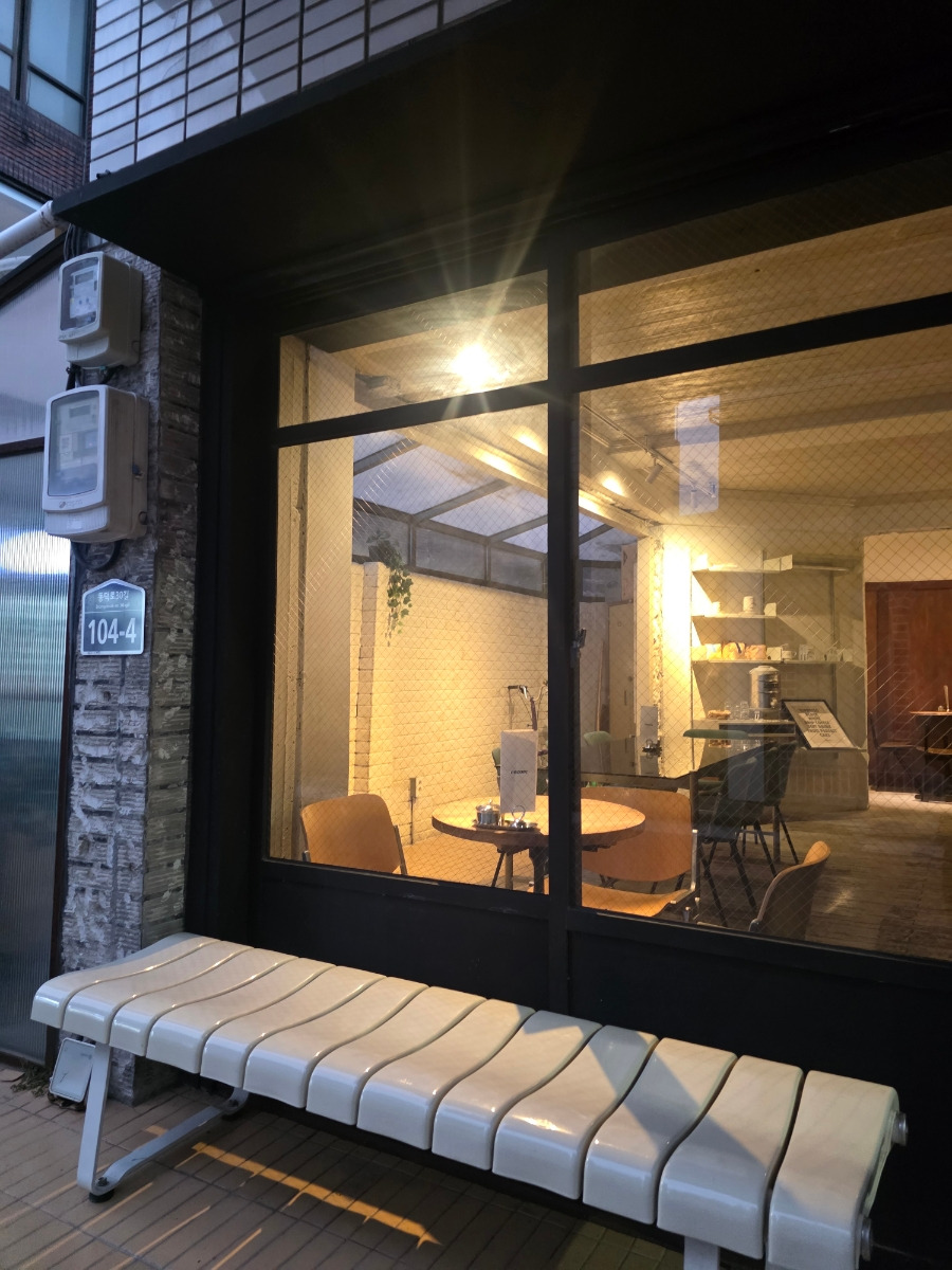 블랙 프레임 외관과 노란 조명이 어우러져 저녁이면 유럽의 작은 로스터리 카페를 떠올리게 해요.