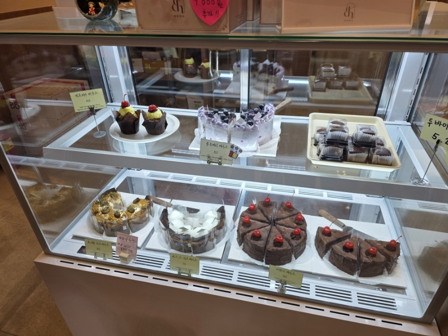 케이크 쇼케이스는 정말 정교하게 정리돼 있고, 조명까지 예뻐서 사진 찍는 순간 바로 인스타 감성샷 완성이에요.