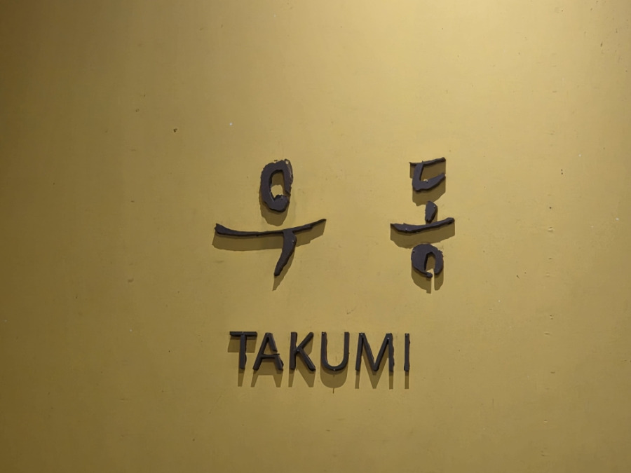 노란색 간판에 ‘타쿠미’가 적혀 있고, 내부는 일본 가정식 집 느낌이 물씬 나요. 레트로한 조명, 우드톤 테이블, 소소한 소품들이 어우러져 정감 있는 분위기예요.