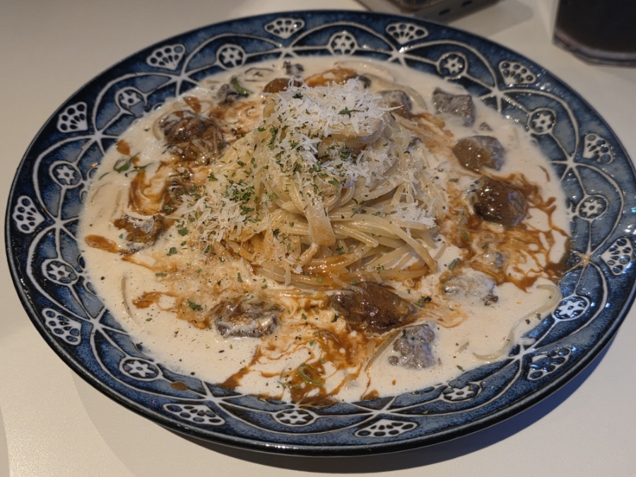 처음 보자마자 꾸덕함 폭발! 고기가 큼직하게 올라가 있고 소스가 진해서 크림파스타 좋아하는 분들은 흔쾌히 만족할 맛이에요. 치즈가루가 고소함을 더해줘서 풍미가 정말 좋아요.