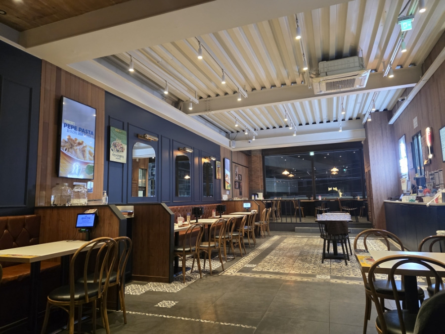 입구에서 올라가면 바로 키오스크가 보여서 주문이 빠르고 간편해요. 내부는 넓고 천장이 높아서 개방감이 좋고, 우드톤 인테리어 덕분에 따뜻한 분위기라 데이트·가족 외식·친구 모임까지 모두 잘 어울리는 느낌이었어요. 특히 창가 테라스 라인은 조명이 예쁘게 떨어져 저녁 분위기가 아주 괜찮았어요 🌙✨