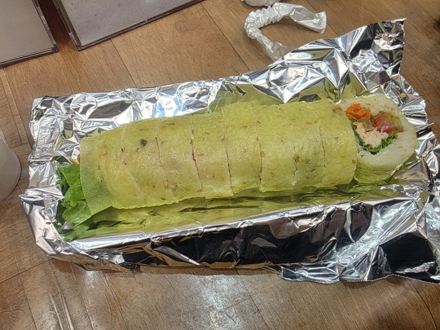 유부피로 감싸진 김밥 안에 신선한 채소와 샐러드가 듬뿍 들어간 스타일이에요. 일반 김밥보다 훨씬 산뜻하고 가벼운 맛이라 부담 없이 먹기 좋았어요.