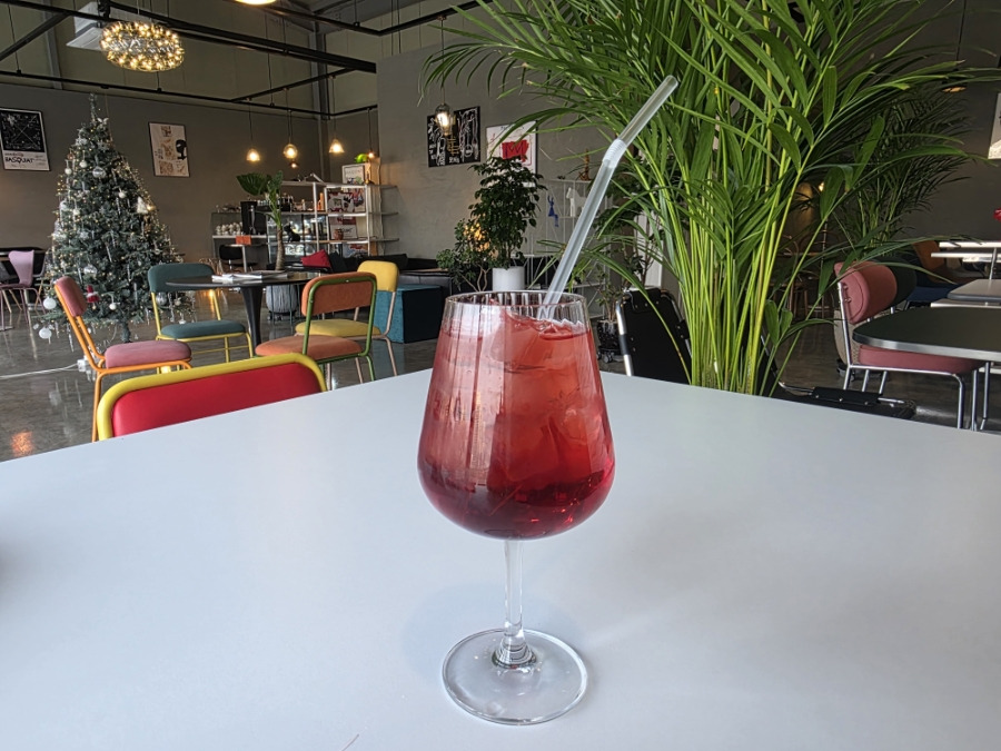 이번에 주문한 메뉴는 히비스커스 티. 와인잔에 담겨 나와서 비주얼부터 인상적이었어요. 짙은 레드 컬러가 분위기와 잘 어울려서 괜히 더 여유롭게 마시게 되더라고요.