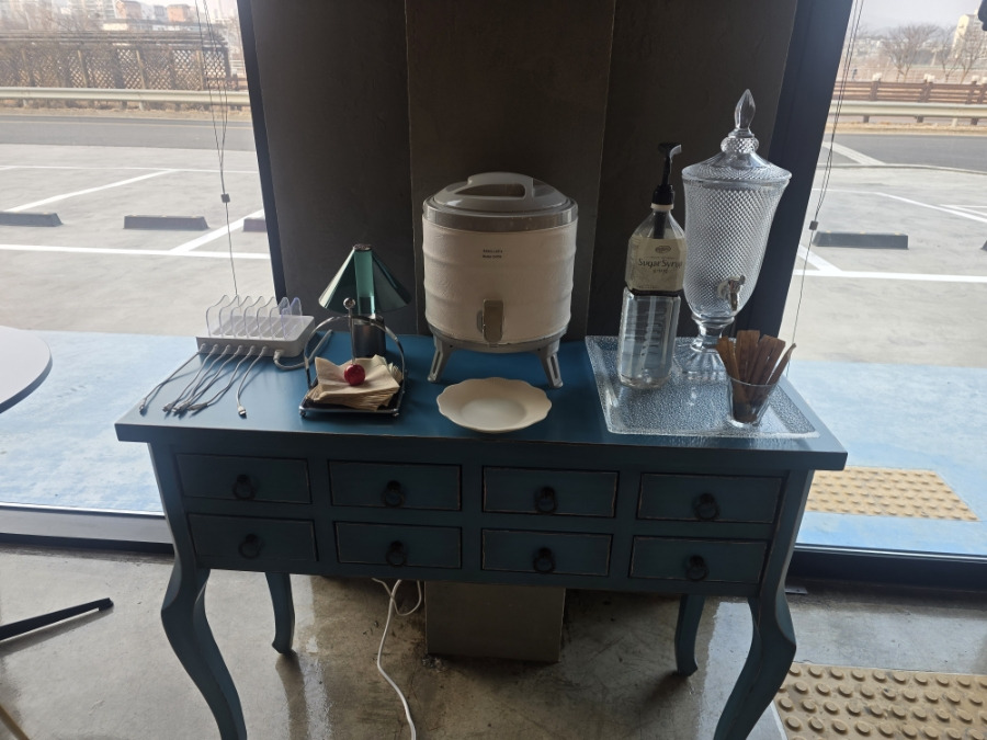 음료를 기다리는 동안 과자가 함께 제공되었는데, 이런 작은 배려가 기분 좋은 포인트였어요. 셀프바에는 물, 시럽, 충전기 등이 정리되어 있어 이용하기에도 편리했습니다.