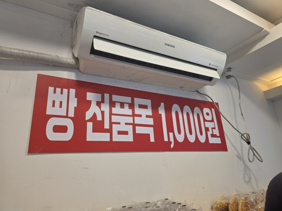 문을 열면 가장 먼저 보이는 건 ‘빵 전품목 1,000원’이라는 커다란 현수막! 선반에는 단팥빵, 소보로빵, 마늘바게트, 메론빵, 치즈카스테라, 피자빵 등 추억과 트렌드가 공존하는 빵들이 가득합니다.