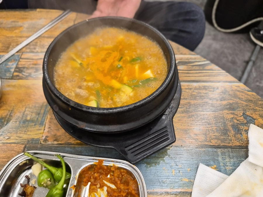 차돌된장찌개는 국물이 진하고 차돌이 들어가 있어 고소한 풍미가 느껴졌습니다. 고기와 함께 먹기 좋은 조합이었습니다.